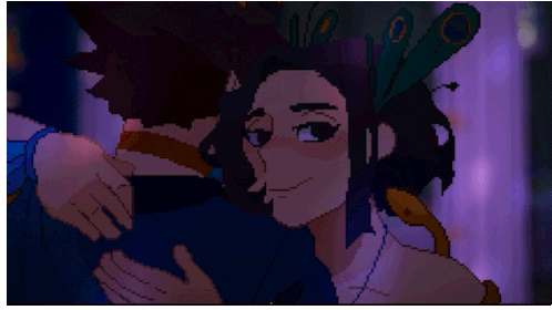 Untilthen Nicolelacsamana and a man share a tender hug in this charming pixel art animation. The woman smiles sweetly, adorned with peacock feathers and a snake accessory.