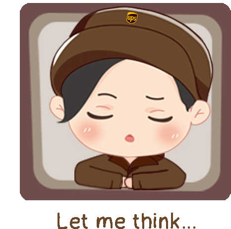 A cute UPS APAC character in uniform ponders with a lightbulb idea, captioned 'Let me think...', perfect for thoughtful moments.