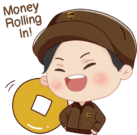 A cute UPS delivery person waves as a drone delivers a package with the text "Arriving Soon!".