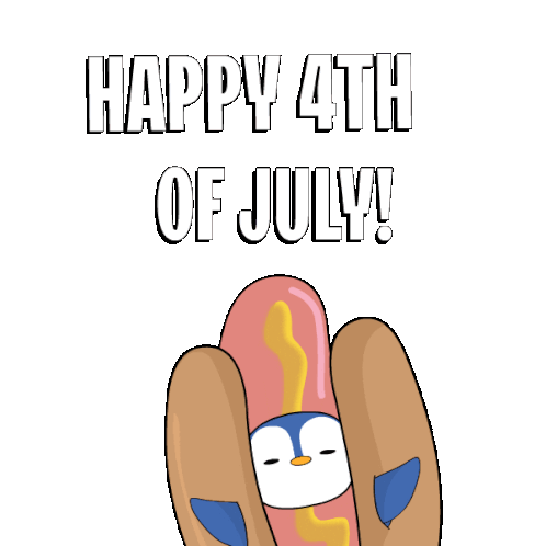 A cute penguin dressed as a hotdog bun with mustard celebrates Happy 4th of July, featuring festive text and a playful animation.