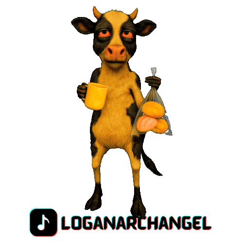 a cartoon cow is holding a bag of oranges and a cup