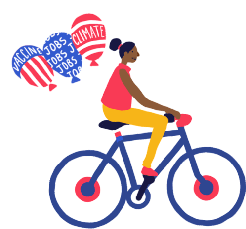 Animated sticker of a woman riding a bicycle with balloons featuring 'Vaccine', 'Jobs', and 'Climate' themes.