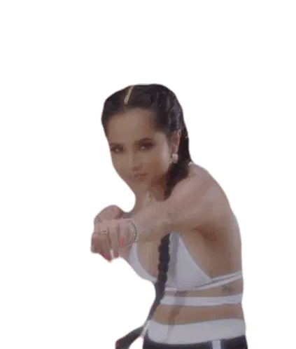 Becky G inviting to dance with 'Vamos A Bailar' text, moving her hand to the rhythm, ready for a party.