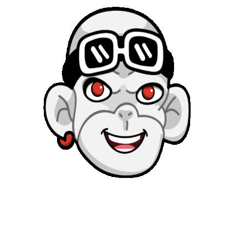 Animated white monkey head with red eyes, black goggles, and a red heart earring, smiling happily.