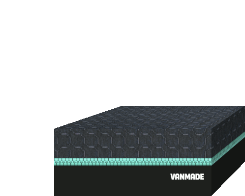 Abstract dark shape with 'Vanmade' text, representing a mattress or sleeping area for a campervan.