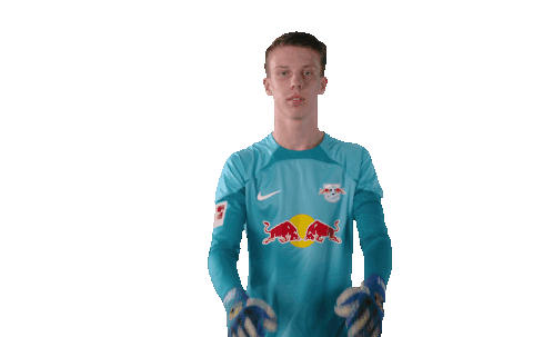 RB Leipzig goalkeeper Timo Schlieck performs the VAR gesture, signaling for a video review during a match.