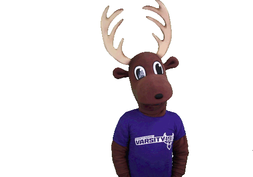 Stanley The Stag mascot, wearing a 'VARSITY19' shirt, performs a dab dance move. Goherts!