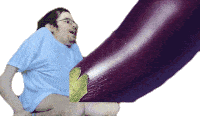 A man in a blue shirt reacts with surprise to a comically large purple eggplant next to him.