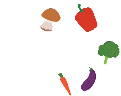 Colorful vegetables like bell pepper, broccoli, mushroom, carrot, and eggplant rotate around a green 'g' symbol, perfect for healthy eating and Philips Airfryer recipes.