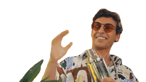 a man wearing sunglasses is smiling and holding a can