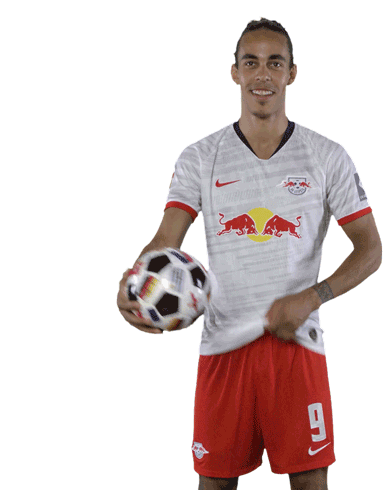 Yussuf Poulsen, wearing his RB Leipzig jersey, playfully hides a football under his shirt, then shrugs with a smile.