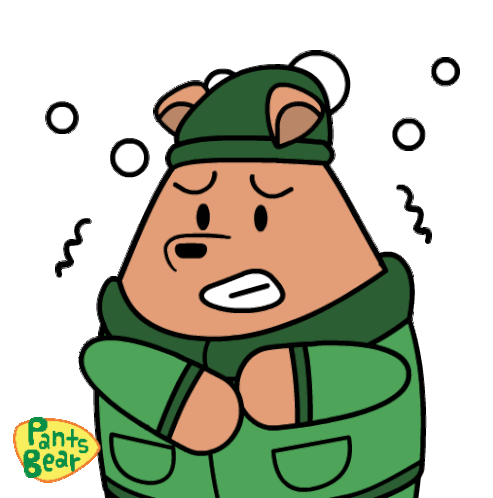 Pants Bear shivers intensely in the cold, bundled up in a green winter coat, hat, and scarf, with snow falling.