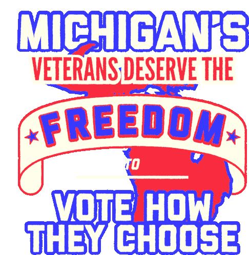 A patriotic sticker advocating for Michigan veterans' right to vote freely, featuring the state outline.