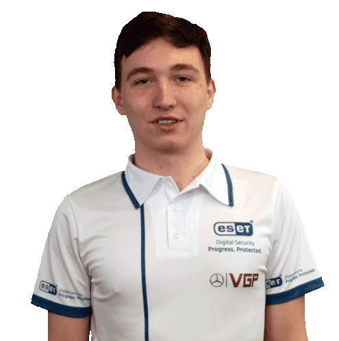 Tomas Koreny, a VGP Virtual GP winner, celebrates with a fist pump, wearing his ESET-sponsored polo shirt.