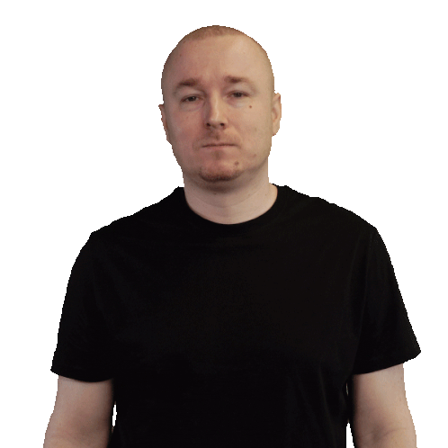 David Urbancik, a bald man in a black t-shirt, looks to the side, likely during a VGP Virtual GP event.