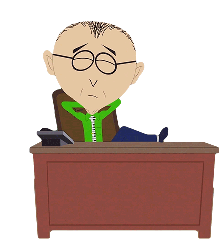 Mr. Mackey from South Park relaxes at his desk, feet up and hands behind his head, looking completely at ease.