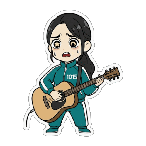 a cartoon drawing of a girl holding an acoustic guitar with the number 1015 on her jacket