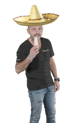 Video Mattie, wearing a sombrero, finishes eating a wrap and declares 'It's a wrap!' in this fun animated sticker.