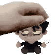 a hand is petting a stuffed toy that looks like a person .