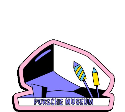 A vibrant graphic sticker featuring the iconic Porsche Museum, celebrating the New Year with colorful fireworks and 'Happy New Year' text.