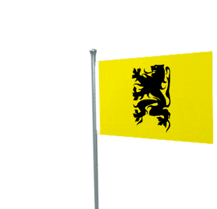 A yellow flag featuring the black Flemish Lion emblem waves proudly on a flagpole against a clean white background.