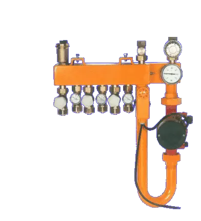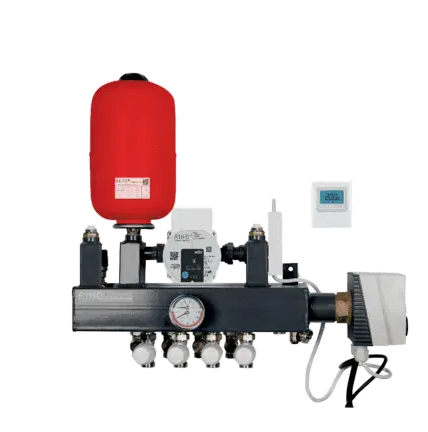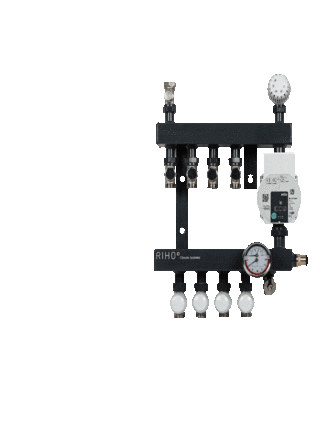Animated sticker of a RIHO Climate Systems underfloor heating manifold, featuring pipes, gauges, and a control unit.