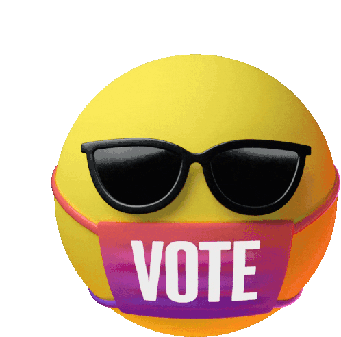 A vibrant yellow emoji wearing cool black sunglasses and a colorful mask with 'VOTE' written on it, encouraging participation.
