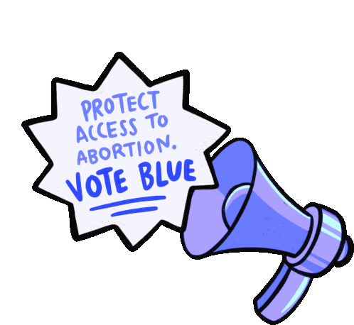 A blue megaphone with a speech bubble urging to protect abortion access and vote blue.