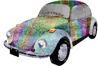 Julee San's vibrant glitter rainbow Volkswagen Beetle sticker, featuring the word 'SAFTINESS' on its windshield.