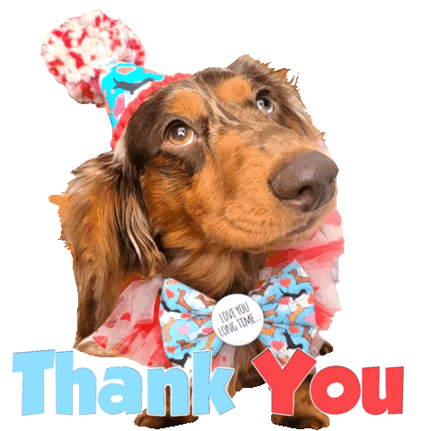 a dachshund wearing a party hat and bow tie with the words thank you behind it