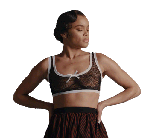 Andra Day striking a fierce pose with hands on hips, wearing a black lace bralette and skirt.