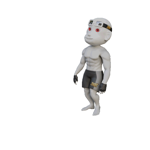 A white muscular cartoon character with red eyes and a headband that says ZHOT walks confidently with a determined stride.