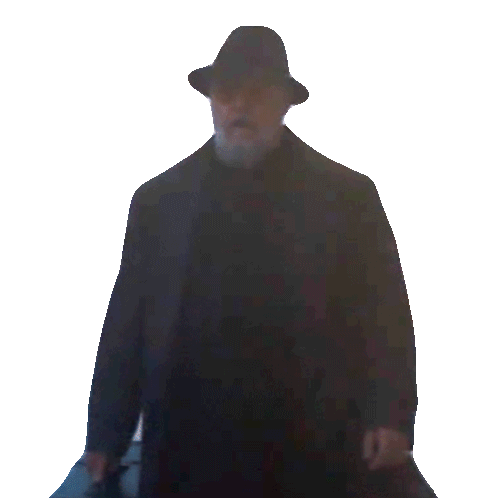 Father Gabriele Amorth, portrayed by Russell Crowe, walks forward in a trench coat and fedora, carrying a briefcase.