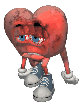 A sad, worn-out cartoon heart with bloodshot eyes and blue sneakers slowly walks, looking tired and dejected.