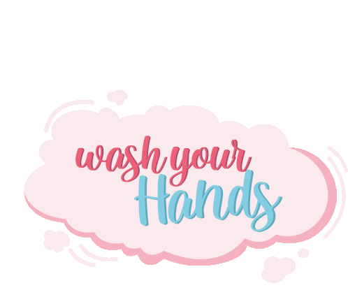 A cute animated sticker featuring the phrase 'Wash Your Hands' in pink and blue text, set against a soft pink cloud.
