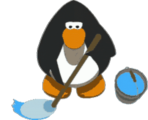An adorable animated penguin diligently mops the floor, standing beside a yellow bucket, making everything sparkling clean.