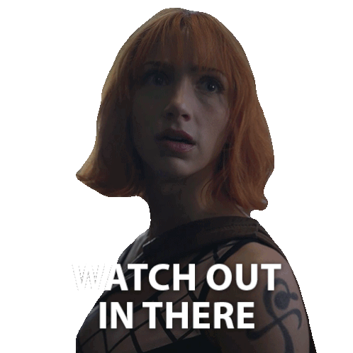 a woman with red hair has a tattoo on her arm and says watch out in there