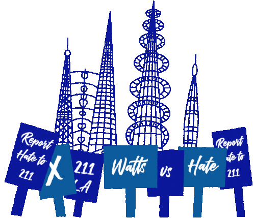 Animated sticker featuring protest signs with messages like 'Watts vs Hate' and 'Report Hate to 211 LA', promoting anti-hate initiatives.