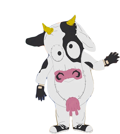 Mooey, the South Park character in a cow costume, waves hello with a friendly gesture.