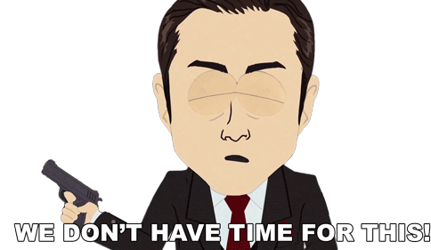 Arthur from South Park, holding a gun and exclaiming 'We Don't Have Time For This!' in an animated sticker.