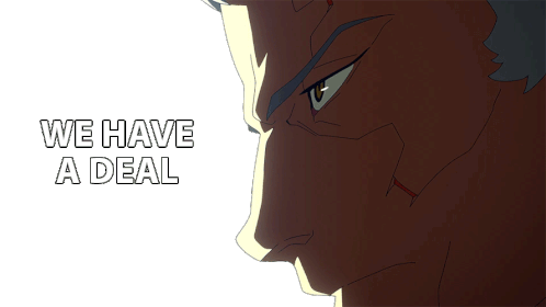 Faraday from Cyberpunk Edgerunners, with a determined expression, declares 'WE HAVE A DEAL' in this animated sticker.
