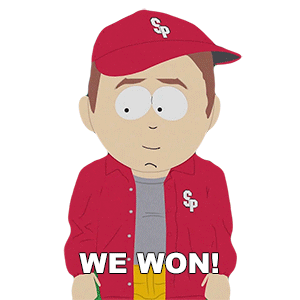 Randy Marsh from South Park celebrates a victory, exclaiming 'WE WON!' with excitement and outstretched arms.