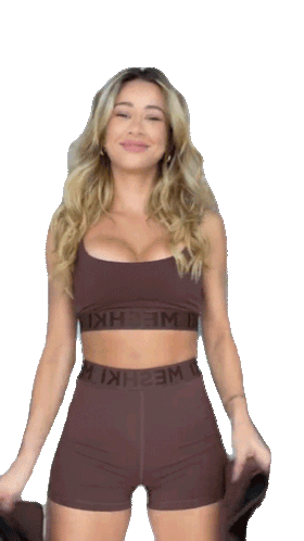 Cindy Prado energetically dances while wearing a brown athletic crop top and shorts, showcasing fitness attire.