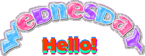 A bright and colorful animated sticker featuring the words 'WEDNESDAY HELLO' with a cheerful, wavy effect.