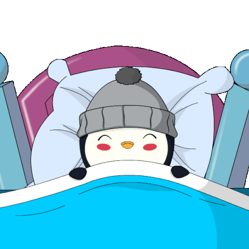 A cute animated penguin wearing a grey beanie peeks out from under a blanket, ready to wake up for the weekend.