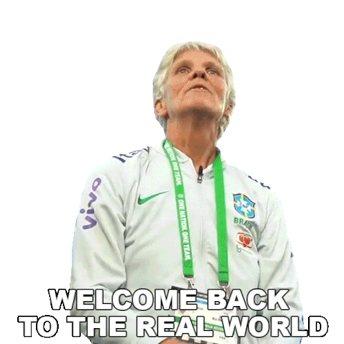 Pia Sundhage, the Brazilian women's football coach, smiles and looks up with the caption "Welcome Back To The Real World."