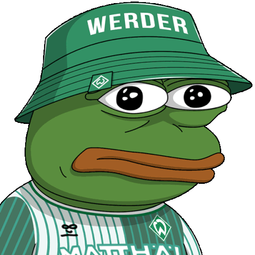 An animated Peepo frog character, a Werder Bremen fan, wearing a green bucket hat and striped jersey, turning its head.