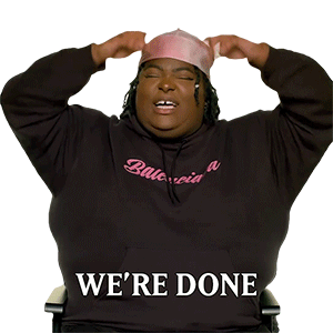 Chika, in a black hoodie and pink durag, dramatically declares 'WE'RE DONE' with hands over face, then crosses arms with a smile.
