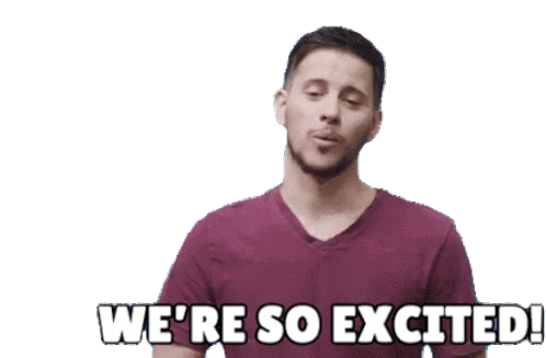 Ryan, a man in a purple shirt, enthusiastically exclaims, 'WE'RE SO EXCITED!' with a wide smile and open mouth.