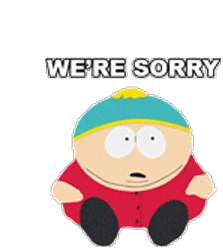 Cartman from South Park expresses deep regret, saying 'WE'RE SORRY' with a changing, apologetic expression.